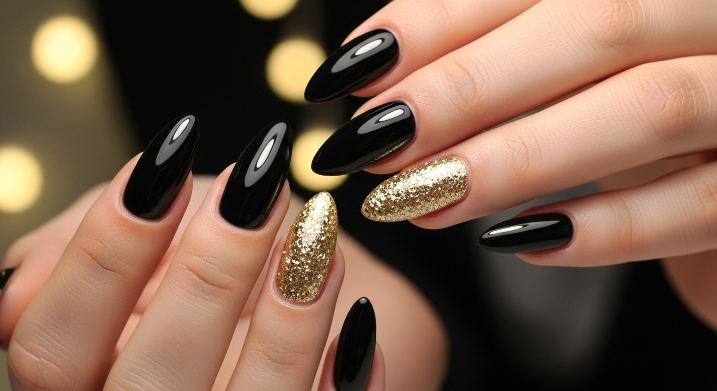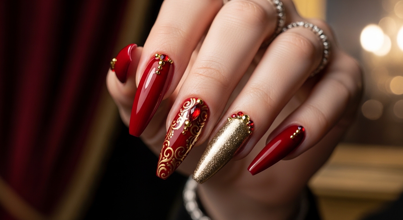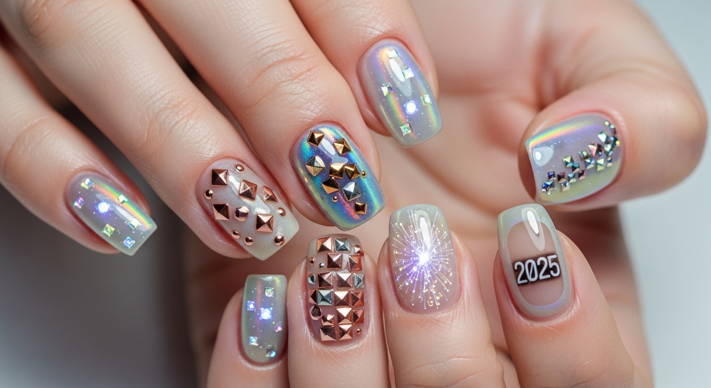 Chrome finishes, glitter accents, stiletto nails, and rhinestones.